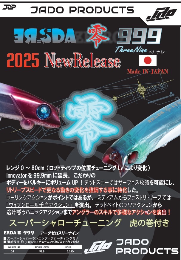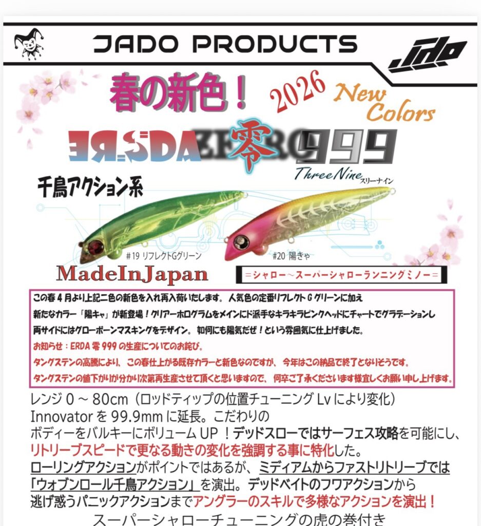 これからも唯一無二というルアーを信念に置き、JADOらしさを追求し、皆様に納得していただける製品を送り出せるよう勤しむ所存ですので、これからも応援よろしくお願い致します。